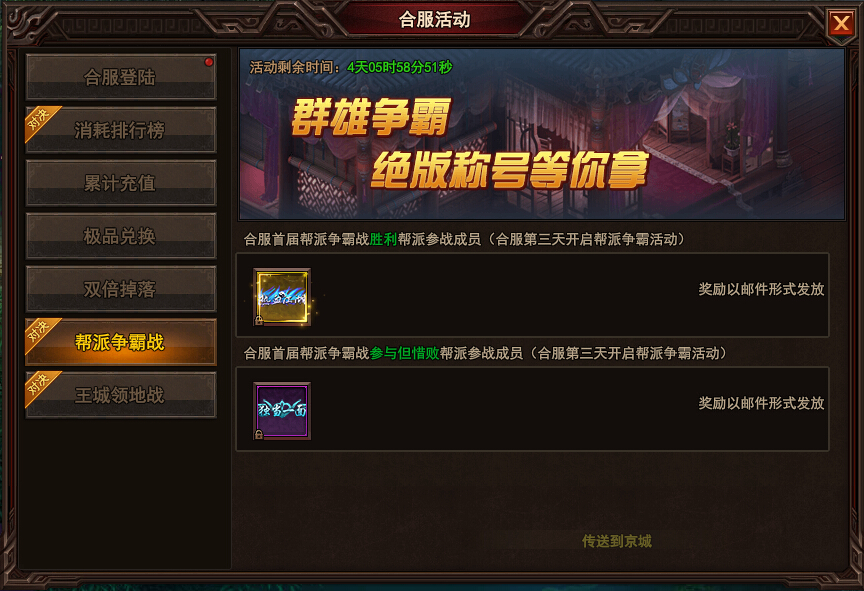 累计登陆5天:装备兑换券*15、坐骑进阶丹*10;