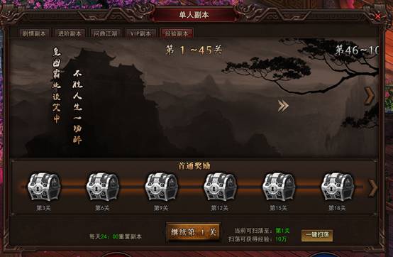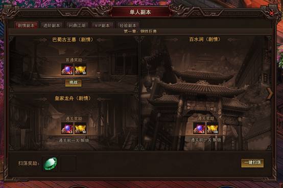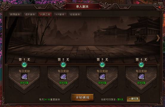 单人副本分为:剧情副本、进阶副本、问鼎江湖、VIP副本及经验副本。