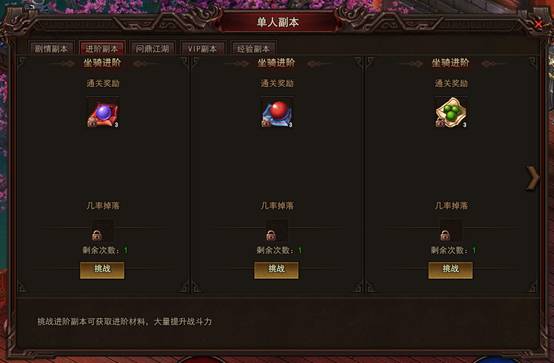进阶副本:获取进阶材料的重要途径,还有几率掉落坐骑装备、光武装备等等。